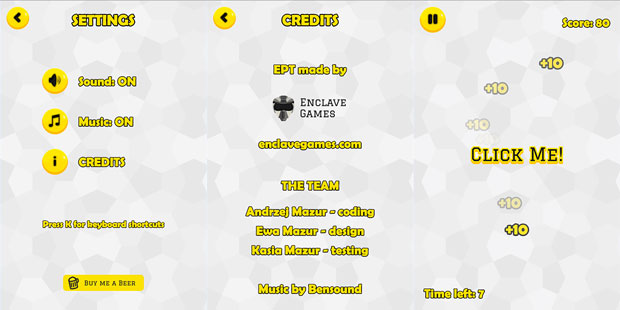 I’m quite happy with how it works now. New design looks better (thanks to Ewa of course), and resembles Enclave Games’ branding. I’ve created the new Settings page and split the audio into sound and music, and added Credits. There’s also new multilanguage support, keyboard controls, and WebFont lib handling custom fonts - all taken from Flood Escape.