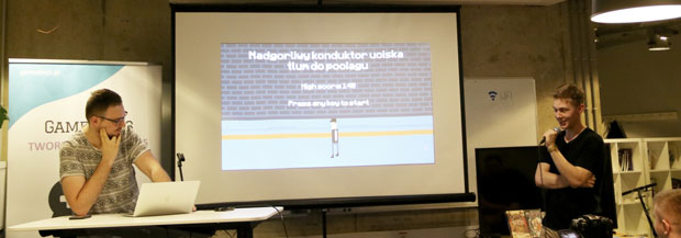 We had two games demoed at the Showcase - first one was Kacper Pietrzak with Bartek Legięć who showed their game jam entry about pushing commuters into a Japanese train.