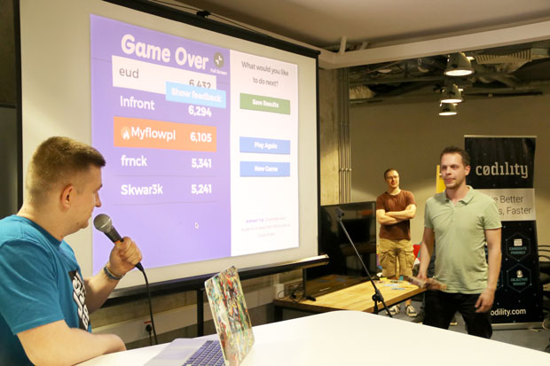 Codility was kind enough to provide us with drinks and pizza too, while the meet.js team covered recording the talks. It was new to us as we paid for the video crew before, but had to cut costs. We’ve started a little bit later than planned, had three talks, short Showcase, and a quiz with cool prizes.