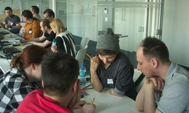The design session was led by Nikola Adamus, who was using pen and paper to help shape the ideas the participants picked up and had to work on. I was leading the second part of the workshop, where after the lunch we were coding a very simple game made in Phaser.