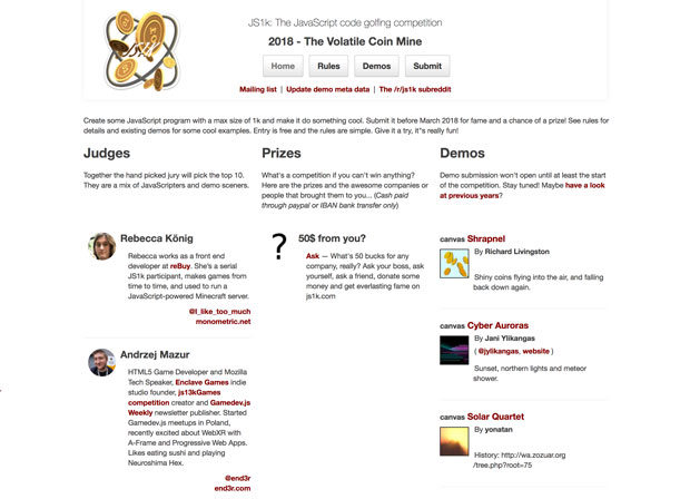 If you’re into trying to fit a small amount of bytes into something visually appealing, be sure to submit that to the js1k 2018 competition - this year’s theme is Coin Mine. I’ll be super happy to judge your submission.