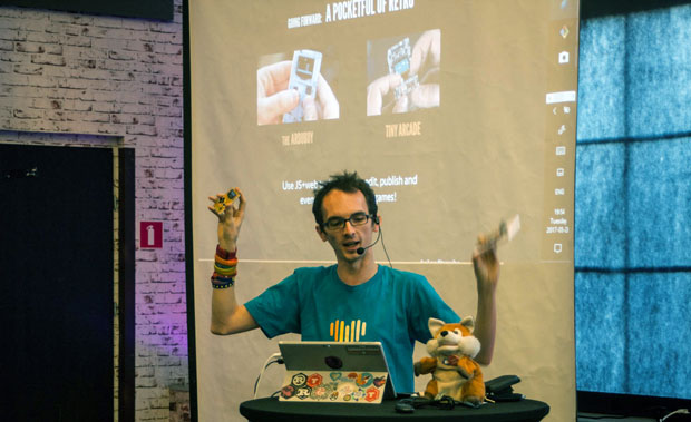 Flaki showed his tiny JavaScript games on microcontrollers.