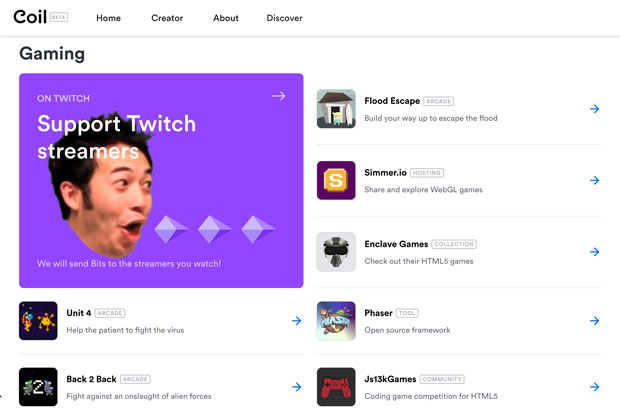 In addition to Coil Member essentials like Coil Blogs and Cinnamon Video, we’ve curated a discovery experience spotlighting gaming, web dev, podcasts and publishers.