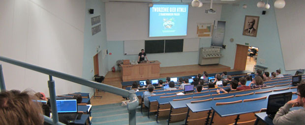 I was invited by Maciej Matyka to visit his students at the University of Wrocław on March 30th and introduce my workshop about building HTML5 games with Phaser.