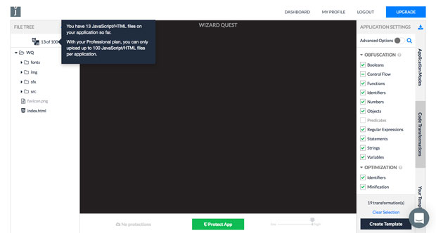 I’ve zipped my game and uploaded it to the newly created project. When I was done reading about the options on the right and selecting some of them I hit the Protect App button at the bottom and then magic happened - Wizard Quest had been prepared and secured on the fly. Jscrambler automatically detected my JavaScript code and applied transformations I picked for the game. The last thing to do was to click the Download App button and get the zip with altered files, which would later on be deployed on my hosting. That’s all - it was way easier than I thought it could be.